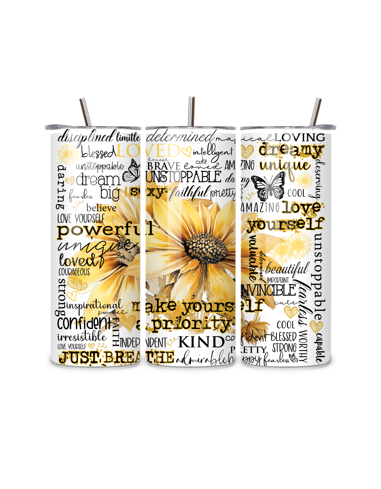 A warm, uplifting tumbler featuring sunflowers and words of encouragement. This bright, cheerful design is perfect for spreading positivity while keeping your drinks hot or cold.